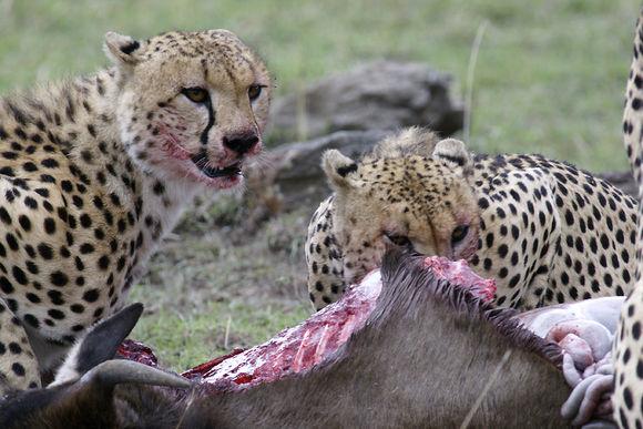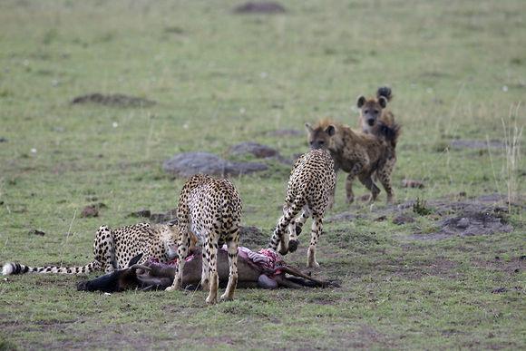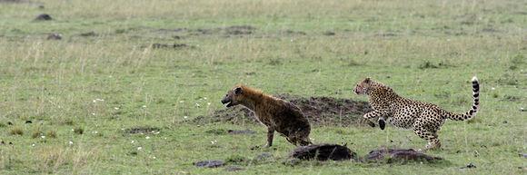 下面的视频里协作的猎豹甚至可以捕获角马和斑马,而且单独撞见斑鬣狗也一点没有害怕的意思,那只单独的鬣狗过来抢食,被猎豹吓走了。鬣狗群是非洲大草原最大的食肉群体,所以猎豹害怕的是被他们围堵。不光猎豹害怕,花豹,落单的狮子遇到鬣狗群也会边吓唬边撤退。鬣狗属于鬣狗科,不是犬科,血统与麝猫相近,在漫长的进化中变得趋近于狗,最大能长到80公斤。鬣狗群和狮群实力相当,经常抢夺狮子的食物,感兴趣的话你们可以搜一搜相关的资料。