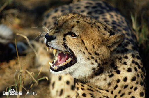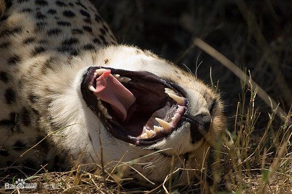 猎豹的牙齿比花豹小,但是足够尖利。这是由于小的头部能保证更高的奔跑速度,头小,牙齿自然会小,也自然没有狮子那强力的下颚。通常不能咬穿猎物的喉管,而是像钳子一样让猎物窒息而死。但是人的皮肤没有毛覆盖,而且比野生动物要薄,喉管也小,猎豹凭借3.5厘米外露长度的犬齿足以咬破人的喉管。通常咬破喉管不会马上致死,人反而会由于吸进大量空气变得更精神,然而附带咬破脖颈的动脉倒是会血流不止有失血过多而死的可能。猎豹的咬合力可达到340 IBS,花豹550 IBS,非洲狮 1050 IBS,东北虎1100 IBS,而斑鬣狗达到了1300 IBS!就是下图这货: