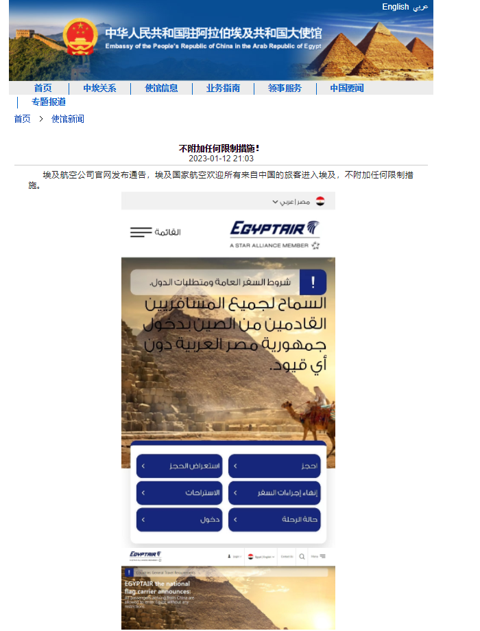 据中国驻埃及大使馆网站1月12日消息,埃及航空公司官网发布通告,埃及国家航空欢迎所有来自中国的旅客进入埃及,不附加任何限制措施。