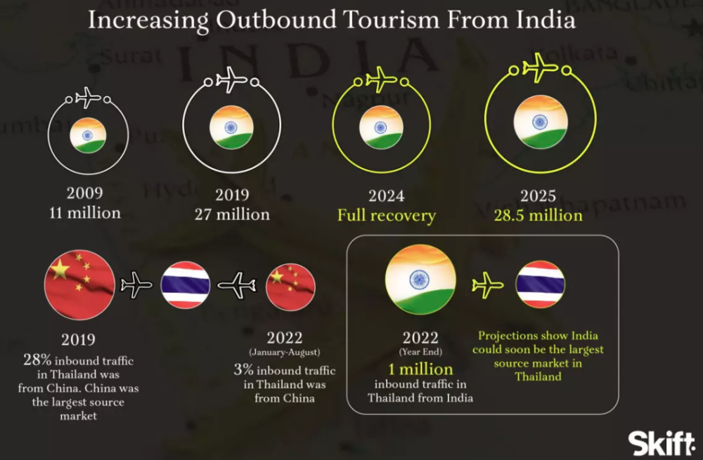 根据Skift的数据,2022年1-8月,泰国入境游旅客中仅有3%来自中国,而在2019年,中国是泰国最大的客源国,旅客数量占比达到28%。2022年,印度入境泰国的旅客数量大概为100万人次,预计很快会成为泰国最大的客源国。