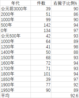 过去5000年间的艺术作品中右撇子创作的比例(斯普林格·巴莱伊,1981年)