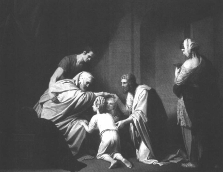 《雅各赐福以法莲与玛拿西》,本杰明·韦斯特绘,1766/1768年(?)油画,101.3×129.5厘米,收藏于美国奥伯林学院艾伦纪念美术馆