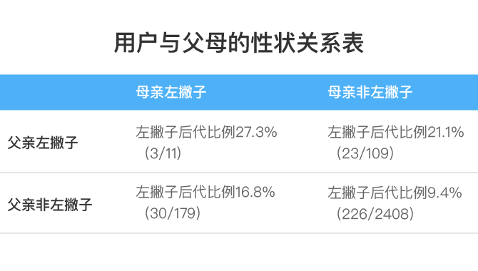 而根据我们口水厂的「身体左右侧偏好调查」(目前参与人数5.6k+),父母都是左撇子的情况下,仅有27.3%的左撇子后代,父母均非左撇子的情况下,仍有约9.4%的左撇子后代。左撇子有一定的遗传特性。