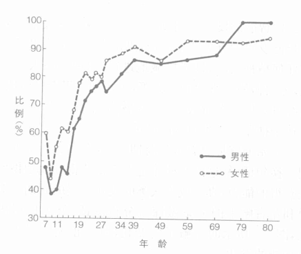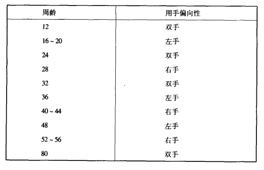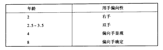 在人的发育过程中,用手的偏向性是逐步显现的。7~9个月大时,婴儿通常还显不出用手的偏向性。一个婴儿,递给他100次玩具,他可能用左手接48次,用右手接52次,不会有明显的差异。到大约18个月大时,用手的偏向性开始显现,但用手偏向性稳定下来则还需要更长时间,常常要持续到9岁左右。这时的孩子会出现用左手接球而用右手抛球和拍球等现象,表明他们还没有完全建立起用手的偏向性。下表列出了儿童用手倾向性在各个阶段的变化。