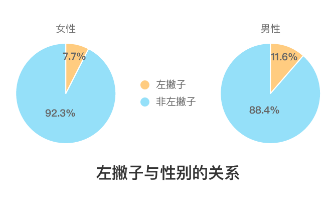 世界上大概有10%的人是左利手,而我国左利手低于0.23%,且男性左利手的人数高于女性(李心天., 1983)。13%的男性和10%的女性是左撇子。婴儿期的左利手会多一些,随着左利手逐渐被纠正,学前期的左利手越来越少。但随着家长们对左利手娃越来越包容,左利手发生率也明显高于30年前。