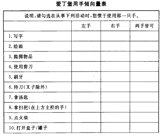 为了有一个标准,对于我们中国人来说,一般可以粗略地判定,左撇子是写字和用筷子天生惯用手是左手的人。其他国家关于左撇子的研究,我们只能含糊地理解为惯用左手的人,而不会深究具体的动作。不过也有一个可供参考的调查工具——“爱丁堡用手倾向量表”,当然它并不是最完美的,因为受访者必须回答十个而不是一个问题,才能看出他们的用手倾向。这个在20世纪70年代发展出来的调查方法,的确比只有一个简单问题的问卷,更能精确地了解受访者的用手倾向。虽然经常被修改,但最基本的爱丁堡用手倾向量表就如下图所示: