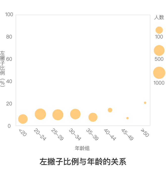 我们口水厂 @微基因WeGene 官网的「左撇子」报告数据(来源于「身体左右侧偏好调查」,目前参与人数5.6k+)发现,随着年龄增长,左撇子在不同年龄层的比例没有明显区别,暂时没有发现随年龄增长而发生变化的趋势,也就是说年龄增长左撇子的人并没有明显变多。