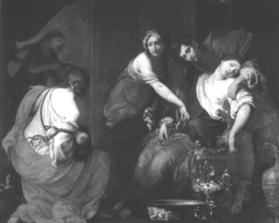 《拉结产子》,弗朗西斯科·弗瑞尼绘,十七世纪油画,189×232厘米,收藏于德国慕尼黑老绘画馆。《圣经》记载,拉结难产死去之前要求给她的儿子取名“便俄尼”(我的痛苦之子);但是,雅各决定给他起另一个名字:便雅悯,字面的意思是“右手之子”(Ben-Yamin),以示神的恩宠。