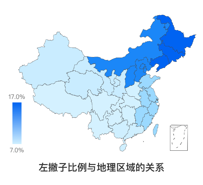 而北部地区出现左撇子的比例较南部更高,东部地区出现左撇子的比例较西部更高。