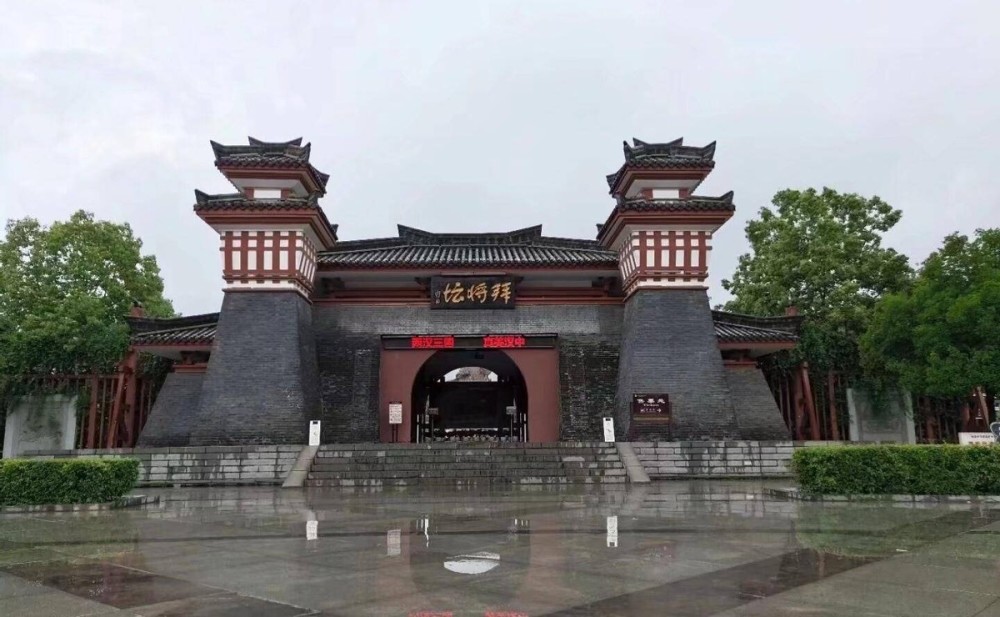 拜将坛也叫拜将台,始建于汉代,为刘邦敬祭天地、拜韩信为大将的发生地和汉室王朝的发祥地。拜将台南北两侧各列有两座方形高台,北台亭阁上有冯玉祥的题联,南台四周为汉白玉栏杆,台脚东西各有两通石碑,东碑阳刻“拜将坛”三字,碑阴刻有《登台对》。西碑阳刻“韩大将韩信拜将坛”八字,碑阴刻七绝诗一首。拜将坛内现有一口重达11吨的铜制世纪大钟,为中国西北最大的铜钟,钟声响起时,声音洪亮,缭绕于拜将坛四周,更显这里雄伟壮观。