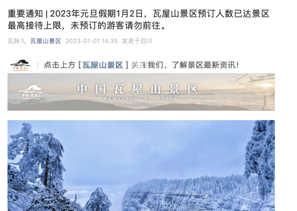 1月1日,四川瓦屋山景区官微发布重要通知称,该景区1月2日的预订人数已达最高接待上限,未预订的游客请勿前往,可选择其他日期游览。