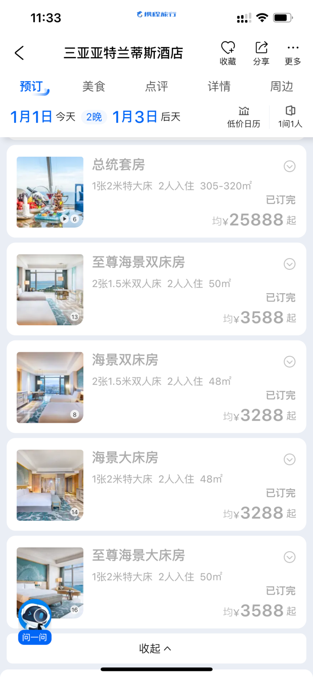 以三亚亚特兰蒂斯酒店为例,截至12月6日18点,三亚亚特兰蒂斯当日预订量比前一天的预订量提升约三倍,元旦假期已出现久违的满房状态。2023年1月1日至1月3日期间,包括过两万元售价的总统套房、至尊海景大(双)床房、海景大(双)床房均订完。