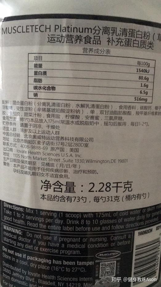 再来看看我常喝的肌肉科技蛋白粉的营养成分:
