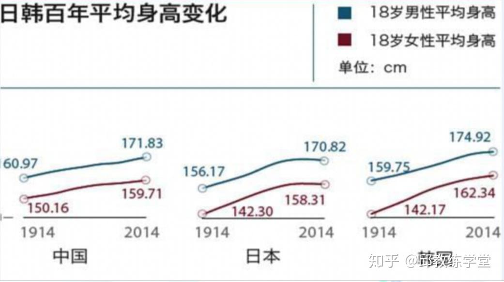 中日韩三国的百年身高比 ,很明显 日本和韩国平均身高增长很快,其中很大部分原因就是他们的饮食结构发生了变化,其中采用更多的是蛋白质,以及牛奶的摄入,