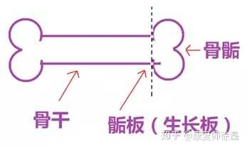 长骨由软骨「骨化」变成坚硬的骨质而成,两端叫「骨骺hou第二声」,中间长长的一段叫「骨干」。人出生以后具有增殖能力的软骨只剩下薄薄的一层,位于骨骺与骨干之间,称为「骺板」或「生长板」,也叫「骨骺线」。
