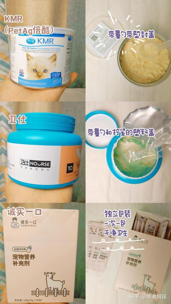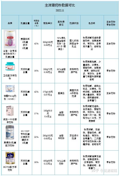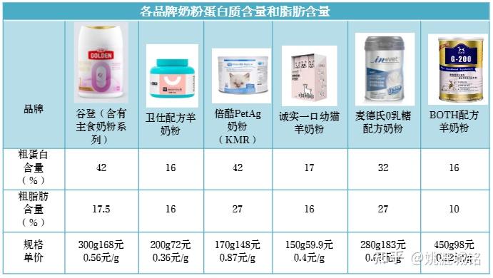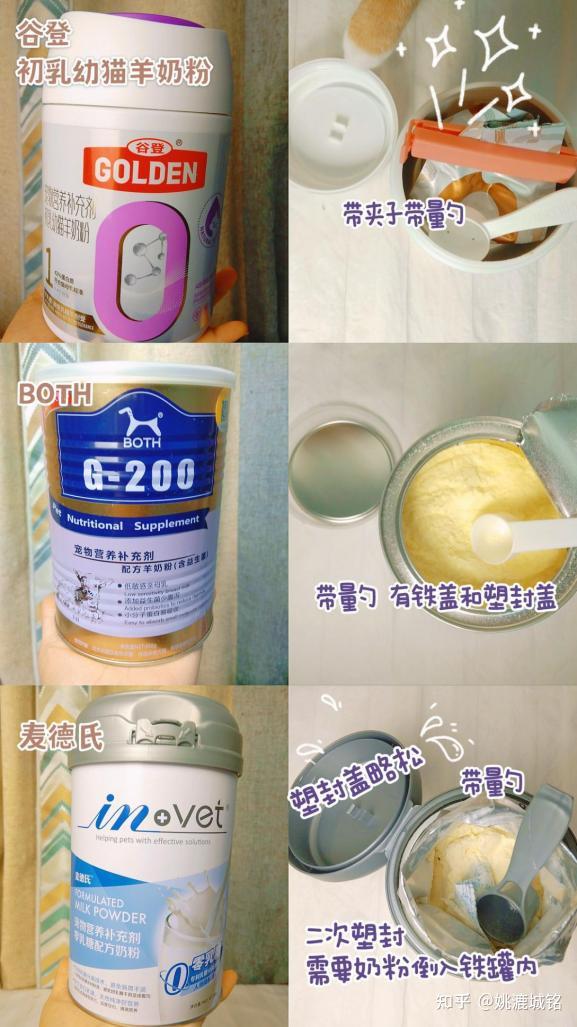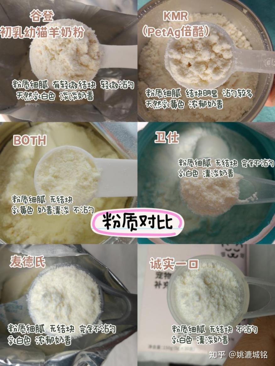 ①谷登1段幼猫初乳羊奶粉(主食奶粉)国产知名品牌。婴儿级别乳源,0乳糖贴近母乳。每年亚宠展谷登品牌展位都会举办人喝羊奶粉挑战,谷登猫奶粉的奶源有充分的品质保证。谷登1段幼猫初乳羊奶粉是主食奶粉,维生素矿物质齐全,新生奶猫可以食用。②麦德氏0乳糖配方奶粉(零食奶粉)美国品牌,台湾艾澌克公司代理。麦德氏这款用的是牛乳粉,相比于牛乳粉更推荐羊乳粉,因为羊乳粉含有更小的脂肪和蛋白质分子。产品明确标注适合2月龄以上猫猫食用。不适合新生奶猫。③BOTH配方羊奶粉(零食奶粉)原料:产品介绍中只提到了山羊奶粉乳脂颗粒小好消化,不易引起过敏,但产品没有明确标注是否含乳糖。虽然麦德氏产品标注可以喂新生奶猫,但是建议作为零食奶粉喂四月龄以上的小猫,不适合新生奶猫。④倍酷PetAg奶粉(KMR)(主食奶粉)原料:脱脂牛乳粉(低乳糖)美国品牌,也是国宝大熊猫在用的品牌,倍酷猫奶粉属于主食猫奶粉,新生小猫也可以喝。⑤诚实一口幼猫羊奶粉(零食奶粉)原料:全脂羊乳粉国产新晋品牌,独立包装每次一小袋5g×30支方便冲泡。产品介绍中没有提到是否含有乳糖。产品标注适用于新生小猫但是依然建议作为零食奶粉喂四月龄以上的小猫,不要拿去喂新生小猫。⑥卫仕配方羊奶粉(零食奶粉)原料:82%全脂羊乳粉国产品牌,价格亲民,产品介绍没有标注是否含乳糖,没有添加维生素和其他补剂。属于基础款猫奶粉,价格实惠适合成年猫食用,不适合初生小猫用。