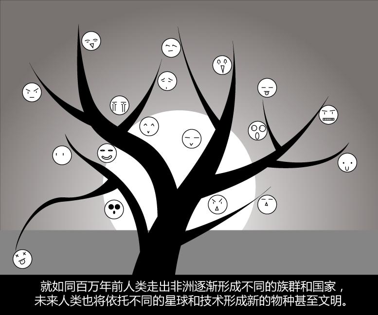 族群分化不但是破解黑暗森林的绝招,也是自我完善的必经之路。进入青年期的人类就如同进入社会的个人一样面临众多“职业”和“居住地”的选择,其中有些选择可能通往天梯,另一些选择却暗藏陷阱。不同的发展方向,不同的社会制度,不同的人伦理念……都代表了截然不同的多彩未来。作为一个种群的人类无法同时亲历多条道路,但却可以自我分化,将一部分人口派遣出去完成那些前途未卜的挑战。有些人群也许会就此消弭瓦解,有些人群却可能获得超越母星的财富与成就……当然,那很可能是人类步入中年期以后的事情了。取得成就: