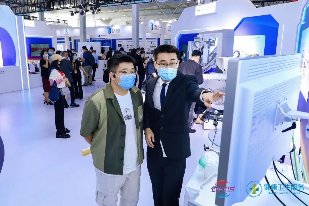 ▲2022年北京服贸会上,神经外科工作人员向参观者介绍便携式智能化神经导航机器人功能