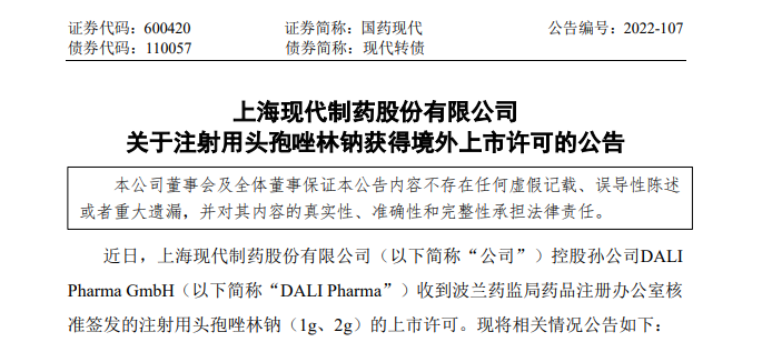 Hikma 等。 DALI Pharma的注射用头孢唑林钠提交欧盟注册DCP流程后,日前获得了波兰药监局药品注册办公室关于1g、2g 规格产品上市许可的核准。截至目前,