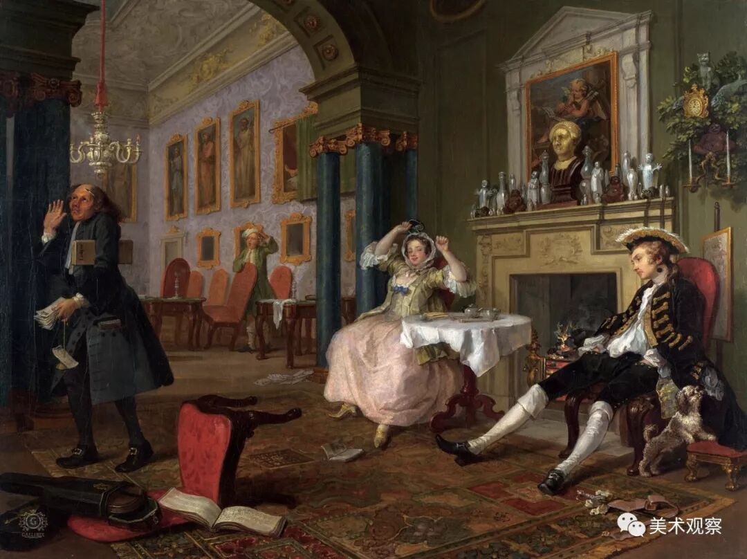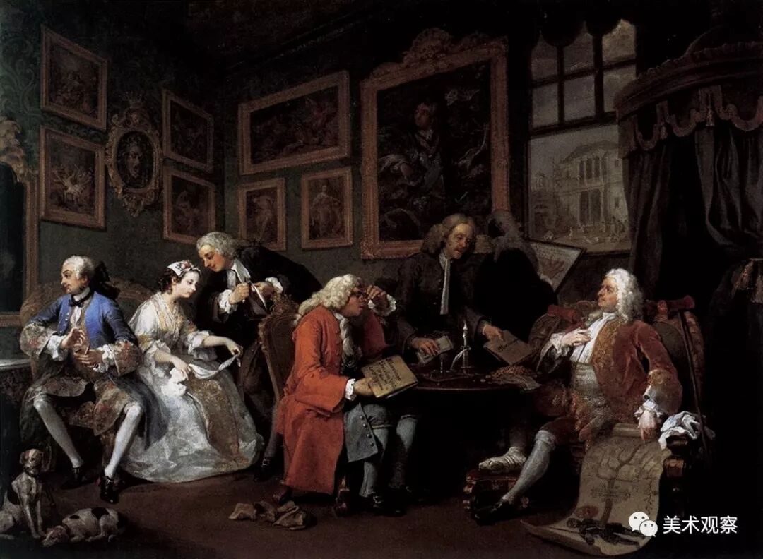 在荷加斯另一幅更为著名的版画作品《时髦婚姻》中,结尾当年轻的公爵夫人去世时,餐室窗楣上也有着一个新教十字徽记的装饰,也许这种对于宗教徽记的有意表现,不仅仅表明了当时英国宗教信仰的普及程度,更表明了作者基于新教伦理在故事结尾惊醒观者的世俗伦理道德目的。相较于《烟花女子夏洛特堕落记》与《时髦婚姻》,《浪子生涯》所讲述的富家子弟因继承巨额财产而受到周围心怀不轨的人们蛊惑,将家产挥霍一空、嗜赌成性,最终锒铛入狱,以致精神崩溃,被送到疯人院的故事,似乎最能体现资本主义初期的新教伦理与社会道德。而且,这些作品都体现了荷加斯“公共道德题材”作品精于叙事的特色,他声称:“我努力按照一个戏剧作家的眼光来处理我的题材,我的画就是我的舞台,而男人和女人则是我的演员,他借着某种动作和姿态来扮演一幕哑剧。”〔10〕所以,在荷加斯的舞台上,一切都为了剧情服务,每一个细节都有着暗示情节内容的特殊作用。威廉·荷加斯 时髦婚姻——早餐 布面油彩 68.5×89厘米 1744由于荷加斯的“公共道德题材”作品中一再出现宗教暗示,我们似乎有必要对十七八世纪英国社会的新教伦理有一个基本的了解,这有助于解释为什么荷加斯不仅在绘画本身,也在对于自己作品的宣传、销售方面投入极大精力;以及为什么荷加斯这些“公共道德题材”绘画会如此受到人们的欢迎,成为很多家庭必备的装饰品〔11〕。英国17世纪兴起的清教运动在1681年光荣革命中奠定了其牢固的社会地位,从卡尔文教发展而来的英国新教(包括长老派、激进派、卫理派等)在教义伦理方面为资本主义时代的到来奠定了基础。卡尔文教的恩宠预选说不仅将现实的事功视为增加神的光耀的表现,而且将现实社会的职业劳动作为获得上帝恩宠的自我确认的最佳手段〔12〕。我们可以想象在仍然以是否获准参加圣餐式来判定基督徒社会地位的时代里,宗教伦理观念会对于整个“国民性”产生怎样的影响,且在现实的伦理道德层面具有怎样的权威。在英国,清教教派为卡尔文教派的天职思想奠定了最为首尾一贯的基础〔13〕,这在英国清教理论代表人物巴克斯特的《基督徒指南》等影响深远的著作中体现得再明显不过。在巴克斯特看来,理性的职业劳动以及在神所指明的合乎法律的道路上获得财富是个人对神所应尽的职责,而在财产上安然歇息,以及对财富的享受与随之而来的怠惰和肉欲是对于“神圣”生活的离弃,他甚至谴责一切工作之外的消遣〔14〕,这种新教伦理被韦伯概括为:“基督新教的入世禁欲举其全力抵制财产的自由享乐,勒紧消费,特别是奢侈消费。反之,在心理效果上,将财货的取得从传统主义的伦理屏障中解放出来,解开利得追求的枷锁,不只使之合法化,而具有直接视为神的旨意。”〔15〕新教伦理在英国此后一个多世纪的社会道德观念中具有着不可动摇的权威,其不仅为英国资本主义的发展积累了大量的原始资本,促进了现代商业与职业理念的形成,更在国民性格、社会思想、文学艺术方面留下了难以磨灭的痕迹。在新教伦理下,积极乐观的职业观念成为评价个人的普遍准则,安于贫穷是可耻并有损于神的荣光的,荷加斯在其事业方面所做的种种用心经营都是在这样的道德准则下理所应当的行为。而他的“公共道德题材”绘画,为入世禁欲的宗教伦理和社会道德提供了生动的教材,每个信奉新教的家庭都乐于将这样的作品装饰在家中,一方面显示主人高尚的道德情操与积极的人生态度,同时也作为教育子女的教材〔16〕,毕竟这些绘画比之于笛福的文字更加一目了然。对于当时英国残留的封建贵族习气,荷加斯从新教伦理角度进行了讽刺与揭露,而新兴资本主义的唯利是图、贪图享乐更是新教伦理与社会道德所不能容忍的,因此,在《时髦婚姻》的第一幅作品中,我们同时看到的是没落贵族与新兴资产阶级市政官的虚伪与唯利是图,也许正是故事结尾的十字架代表了作者客观的新教伦理与道德立场。