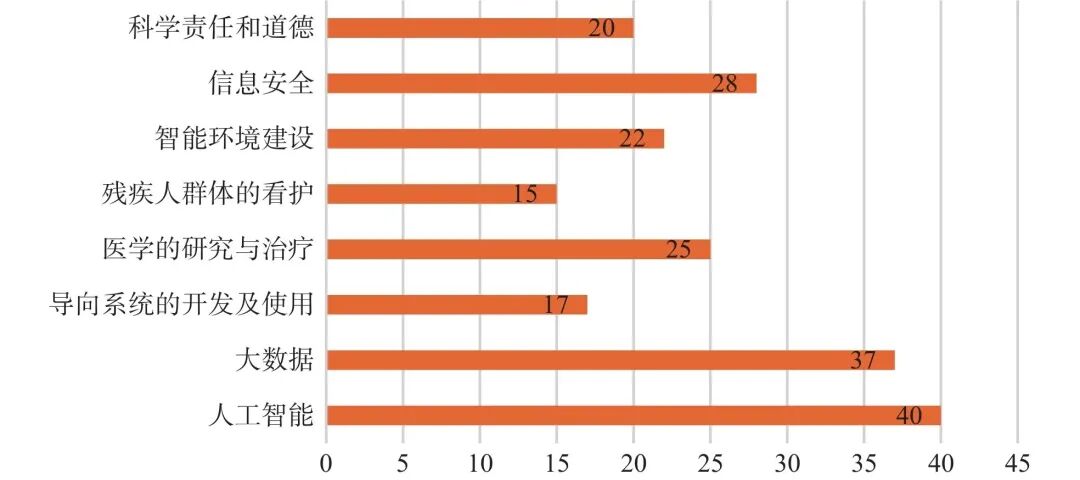 我们进一步对报道的主题进行了分析(见图2)。报道主题可以分为两类:一是报道的中心议题即是大数据和人工智能技术;二是为使大数据和人工智能技术更加清楚、确切地展现在受众面前,报道并不直指技术本身,而是适时地围绕大数据和人工智能技术以及公众热切关注的事件展开报道中出现频率较高的主题包括:导向系统的开发及使用、医学的研究与治疗、残疾人群体的看护、智能环境建设、科学责任和道德等。图3进一步显示了媒体报道中关于人工智能技术报道的关键词。