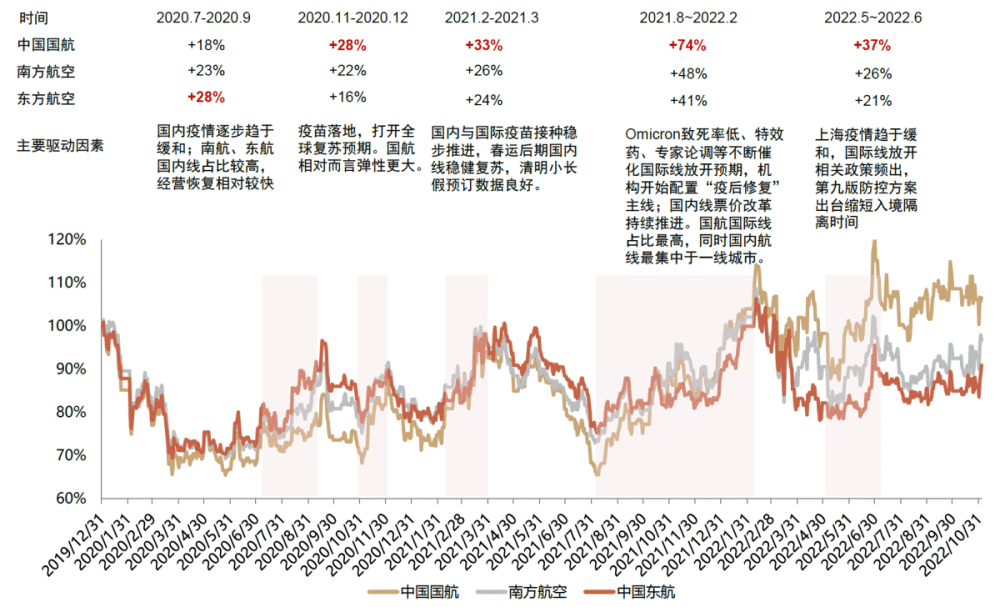 图表:中国航空业股价复盘:疫情以来的机会主要来自疫情防控的改善,与基本面关系弱