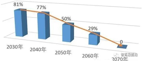基于2010年数据的碰撞事故总数下降趋势(2030-2070年)