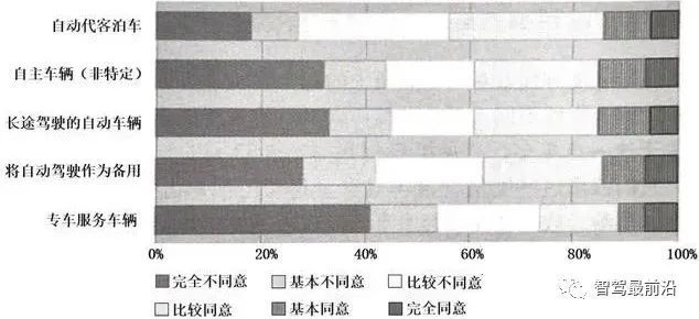 在德国一项有关自动驾驶的调查中,当受访者被问到是否会准备用自动驾驶车辆替换现有的首选交通方式,只有11%-15%的人对这一说法大部分或完全同意,有27%的人表示,他们从未想过或者根本无法想象,用自动驾驶车辆去替代现有交通方式。当针对具体应用场景时,拒绝使用自动驾驶替代现有交通方式的比例提升到了44%-54%。这意味着随着场景描述的更精准,拒绝的想法变得更强烈,接受程度最低的是专车服务,有54%的人拒绝,仅有11%的人同意。