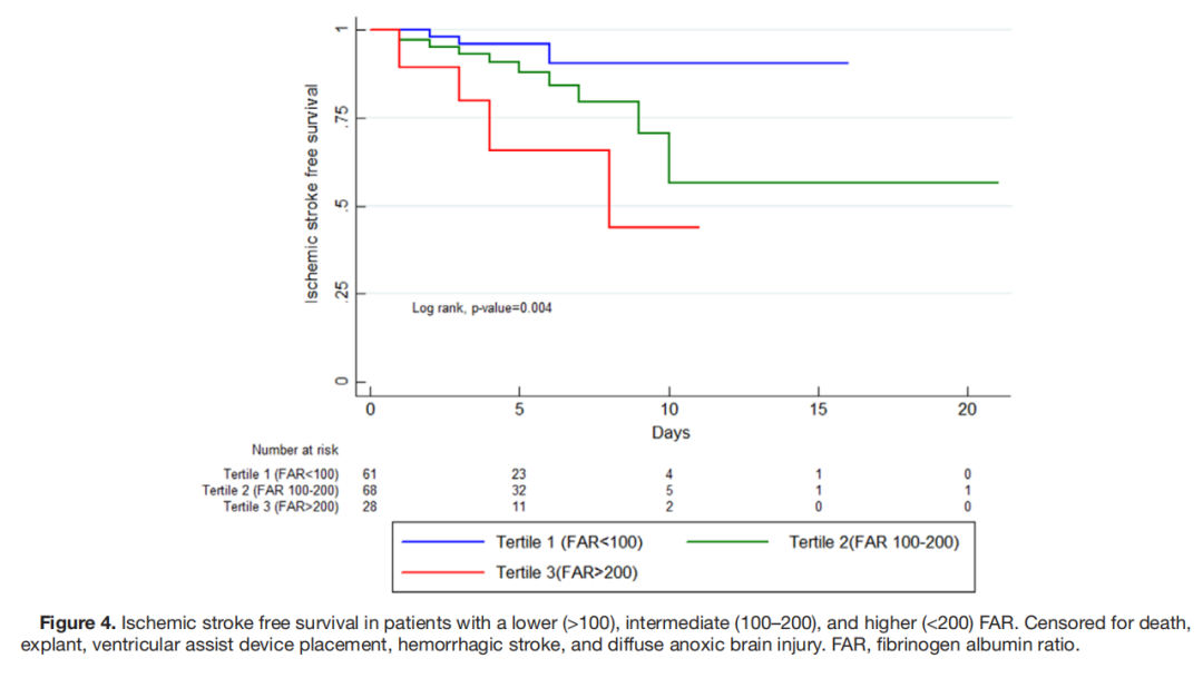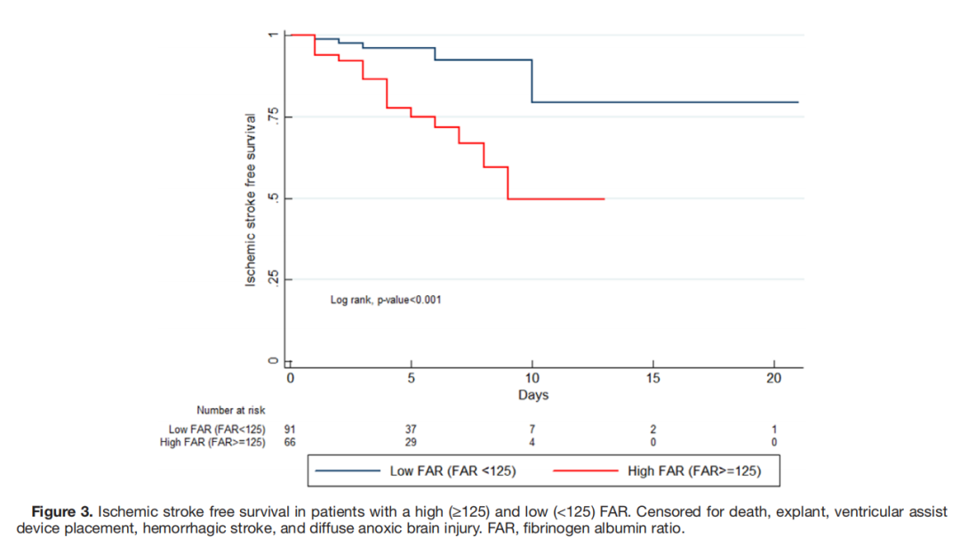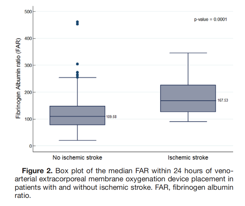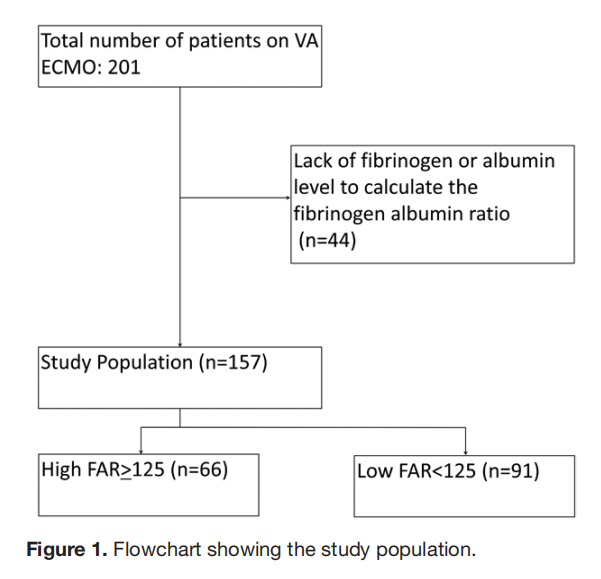 纤维蛋白原是凝血因子和血小板聚集的主要决定因素之一。另一方面,白蛋白抑制血小板功能和血栓形成。综上所述,纤维蛋白原与白蛋白比值(FAR)的升高已被描述为血栓前状态下疾病严重程度的一个标志。我们评估了在静脉-动脉体外膜氧合(VA ECMO)支持期间,FAR和缺血性卒中的相关性。采用单中心、回顾性研究,包括所有接受VA ECMO治疗的成年患者。FAR是VA-ECMO置入前24小时的纤维蛋白原和白蛋白测量计算的。将患者分为高(≥125)组和低(<125)FAR组,并确定最终发生缺血性卒中的风险。有201例患者接受了VA ECMO治疗,157例患者计算了FAR。他们平均年龄56±14岁,66名(42%)为高FAR。VA ECMO期间高FAR患者无缺血性卒中的生存率较低(log rank p<0.001;调整风险比5.51;95%CI:1.8-16.5)。在三分位数分析中,FAR水平与最终缺血性卒中的可能性逐渐增加相关(logrankp=0.004)。FAR高的患者有更大的平均血小板体积(10.8[10.4-12]vs.10.5[10.2-11.9]fl,p=0.004)。在VA ECMO放置的前24小时内,FAR升高与随后发生缺血性卒中的风险更大相关。我们的研究结果表明,在VA ECMO放置后不久评估FAR可能有助于对有缺血性卒卒中险的患者进行早期分层。在过去的十年中,静脉-动脉体外膜氧合(VA ECMO)在难治性心源性休克患者中的使用显著增加。尽管技术取得了重大进步,但相关的发病率仍然很高,只有约40%的患者存活到出院。超过三分之一的患者可能发生神经系统并发症,导致住院时间更长,住院死亡率更高。尽管神经系统并发症的发生率在过去的十年中有所下降,但卒中的发病率仍然升高,据报道占高达33%的患者。此外,卒中发生率可能被低估,因为大约9%的VA ECMO患者卒中在临床上未被识别。神经损伤的一些危险因素包括低血压、代谢性酸中毒和ECMO持续时间等。然而,目前还缺乏对即将发生的卒中的预测性生物标志物。纤维蛋白原是一种由肝脏合成的血浆糖蛋白(GP),是体内最丰富的凝血因子。作为一种急性期反应物,在心源性休克的重症患者中因炎症而升高,在需要机械循环支持的患者中常见。纤维蛋白原水平的升高与较高的纤维蛋白形成率、血栓纤维蛋白含量、纤维蛋白网络稳定性和血小板聚集相关。白蛋白是一种直接和间接抑制血小板和血栓形成的血浆蛋白。综上所述,纤维蛋白原/白蛋白比值(FAR)升高已被描述为各种血栓前状态下疾病严重程度的标志,如ST段抬高型心肌梗死、慢性静脉功能不全和缺血性视网膜静脉阻塞。然而,FAR在预测VA ECMO患者缺血性卒中中的效用尚不清楚。在这项研究中,我们试图评估在VA ECMO支持期间,FAR和缺血性卒中之间的关系。材料和方法所有于2012年1月至2017年9月期间在Montefiore医疗中心住院并接受VA ECMO治疗的成年患者(18岁及以上)均纳入本回顾性研究。患者在VA ECMO支持期间使用由RotaFlow离心泵和Maquet Quadrox氧合器。为了排除围手术期事件,排除了VA ECMO<24小时的患者。在VA ECMO放置的最初24小时内没有白蛋白或纤维蛋白原数据的患者被排除在外(图一)。缺血性卒中的定义是:i)经神经病学会诊证实的新发神经症状,ii)相应的急性脑梗死,头部计算机断层扫描未见出血。FAR使用在VA ECMO启动前24小时内记录的同时进行的纤维蛋白原和白蛋白的测量结果进行计算。分类变量以百分比表示,并采用χ2检验进行评估。连续变量用平均值(±标准差)或中位数(25-75%四分位数)表示,并分别使用t检验或Mann-Whitney U检验进行评估。采用Kaplan-Meier法计算观察期间无缺血性卒中的生存率。采用Log-rank检验来比较从Kaplan-Meier估计数中得到的生存曲线。观察时间从开始使用VA ECMO起,并排除出血性卒中、停用VA ECMO、设备升级、心脏移植或死亡。计算Cox风险比(HRs),以估计在FAR界值为125时发生缺血性卒中的风险。该界值是通过使用受试者工作特征(ROC)曲线得到的。在控制了单变量p<0.2的协变量,包括高血压、基线肌酐、平均血小板体积(MPV)房颤和VA ECMO小时数后,计算调整后的HRs和相应的95%置信区间(ci)(模型1)。在控制了年龄、ECMO指征和VA ECMO总持续时间后,我们创建了一个单独的模型(模型2)来计算调整后的HR。为了限制过度拟合,VA ECMO的适应症被分为心脏切开术后休克和非心脏切开术后休克。所有报告的统计检验均为双侧,p<0.05被认为显著。所有分析均使用Stata14.0 (StataCorpLLC,德克萨斯州)进行。该研究得到了Montefiore医疗中心伦理审查委员会的批准。 结果病人特征在研究期间,有201例患者接受了VA ECMO置入。如图1所示,44例患者在VA ECMO启动后的24小时内没有测量纤维蛋白原或白蛋白,被排除在外。其余157例患者纳入研究人群,年龄平均为56.5±14.0岁;97例(61%)有高血压病史,55例(35%)有糖尿病。VA ECMO放置的主要指征是心脏切开术后休克(31%),其次是急性心肌梗死(27%)。在放置VA ECMO时,乳酸平均为8.6±5.6mmol/L。66例(42.04%)患者存活至出院。