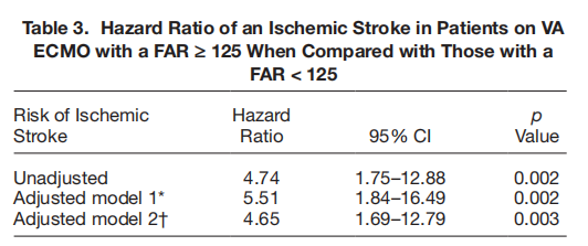 在调整了高血压、肌酐、MPV、房颤和VA ECMO支持时间后,与低FAR组相比,高FAR组缺血性脑卒中患者的aHR为5.51,95%CI:1.8-16.5,p=0.002(表3),在另一个调整了年龄、适应症和VA ECMO持续时间的模型中,aHR保持升高为4.65,95%CI:1.69–12.79,p=0.003(表3)。高FAR患者的出院生存率在22(33.9%)比44(48.9%)更低,p=0.06,表2。