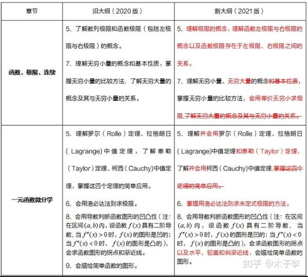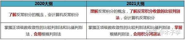 数学一主要是增加了反常积分敛散性的比较判别法、无穷级数增加积分判别法,然后一些内容由原来的了解、会用改为了理解和掌握,要求有了一定的提高。