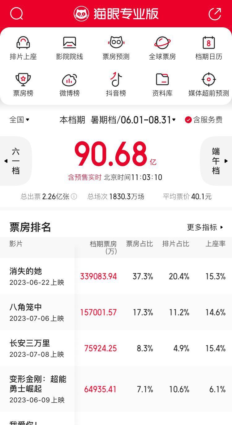 截至记者发稿时,2023暑期档(6月1日-8月31日)票房已经突破90亿元,如果换一个更直观一点的参照物,也就是说,目前2023暑期档的票房,就已经逼近2022暑期档的总票房(91.35亿元)。现在2023年暑期档还有一个多月的“冲业绩”时间,在剩下的八月份,随着《封神第一部》《超能一家人》《热烈》《巨齿鲨2:深渊》等热门新片的接连上映,市场的火热也势必将持续攀升,而票房数字的上扬红线,也奔着更高远的目标迈进。