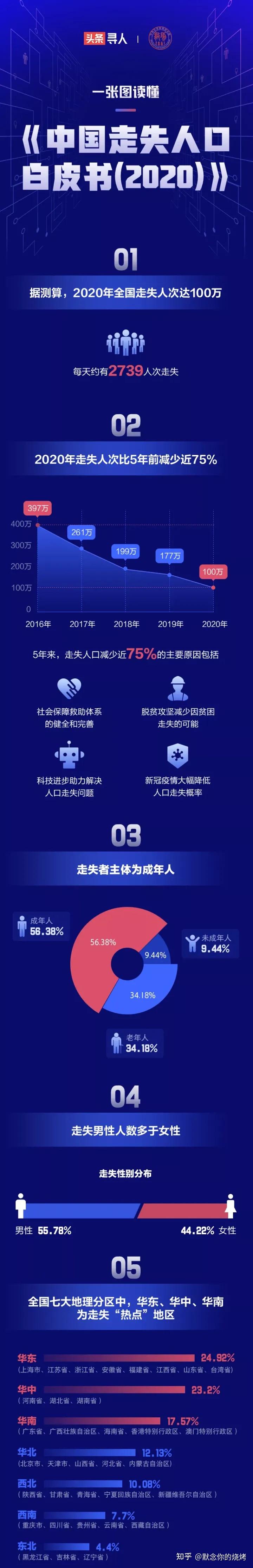 100的数据并不是说每年有100万人彻底消失,而是报警登记数。其中成年人占比56%多,老年人占比34%多,剩余9.4%左右是未成年人。也就是说,18岁以下的登记人次应该是在9.4万人次。