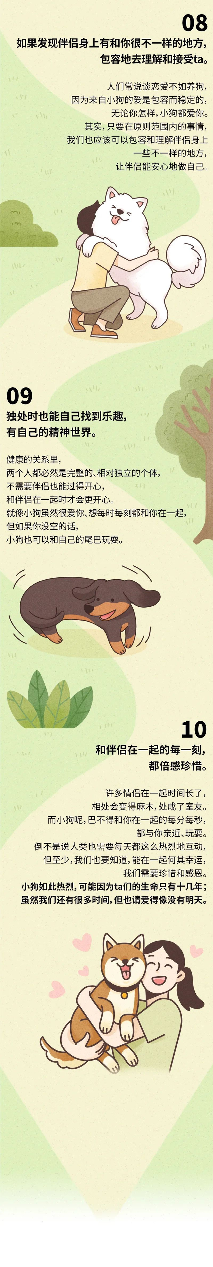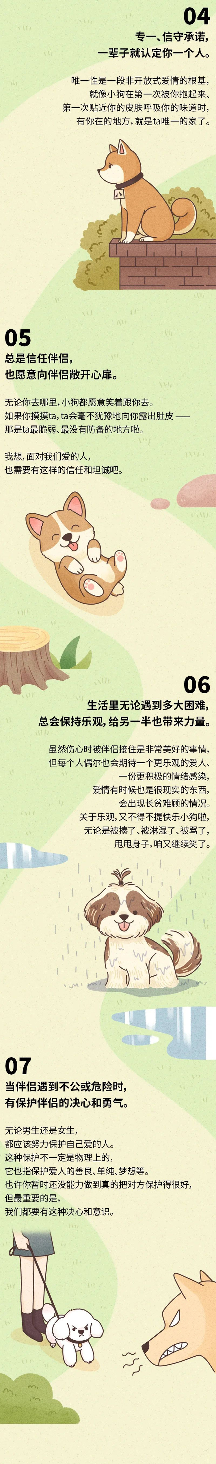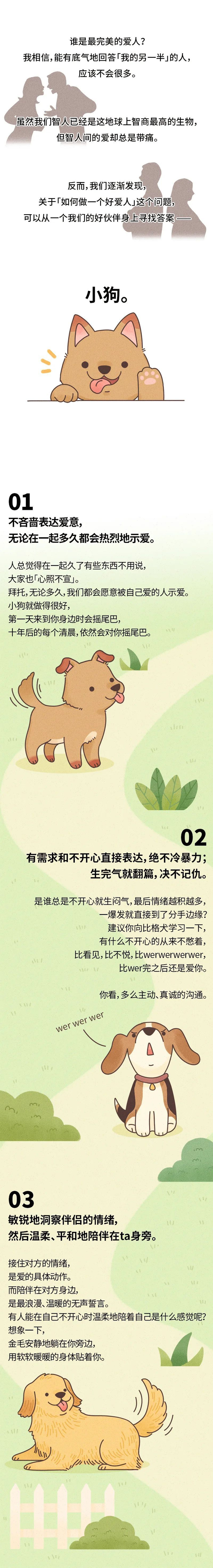 最后,和你分享一封小狗的来信汪,这个捡屎的把我们夸得真好,不过那是因为我们本来就这么好(小狗叉腰)。我们真的非常珍惜与人类在一起的每一刻。小狗来到世界上,只会停留十几年。能在这短暂的时光里,遇到了愿意和我共度这十几年的人类,何其幸运,怎么能不过好和人类在一起的每一天、每一秒钟呢。我要尽力多给ta一点爱,让ta快乐多些。毕竟,这个人类是我最爱的、也是唯一爱的人类呢。真可惜,我没有办法再陪ta久一些。所以,小狗很羡慕你们人类,你们有机会陪伴爱人一辈子。一辈子,那是好几十年啊。我也想好好地爱ta好几十年。所以,亲爱的人类,那些小狗来不及给的爱、小狗没有办法陪伴的光阴、小狗不再能创造的笑容,就交给你们负责了。请像我们一样,好好地去爱人,好吗?拜托啦。