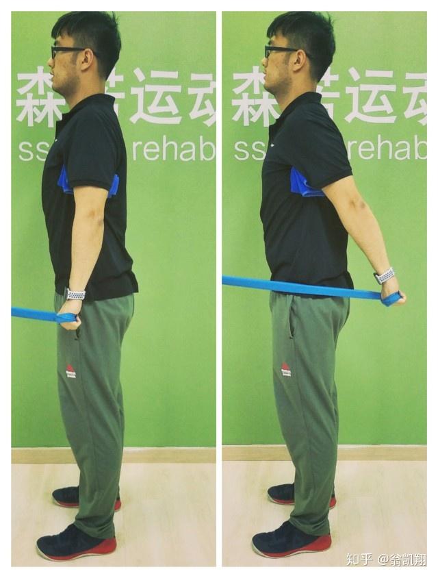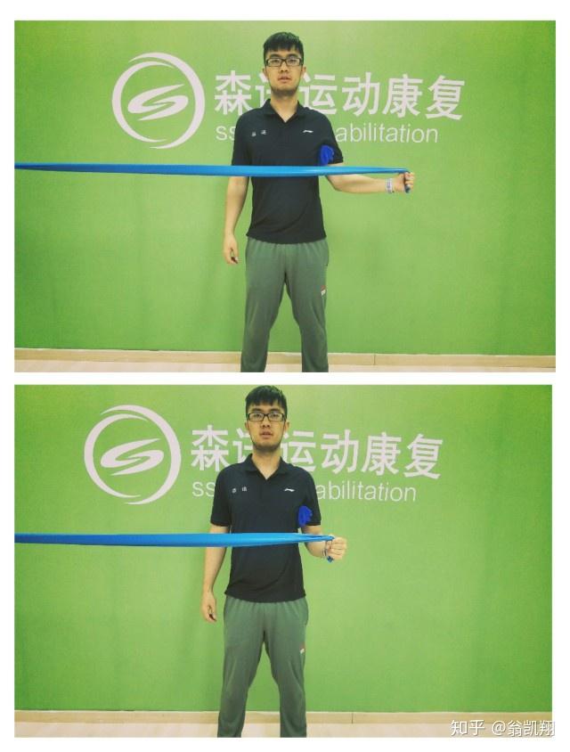 1、加强大圆肌:站立位,一侧夹紧毛巾,在不离开毛巾的前提下向外打开小臂,用力拉紧弹力带。
