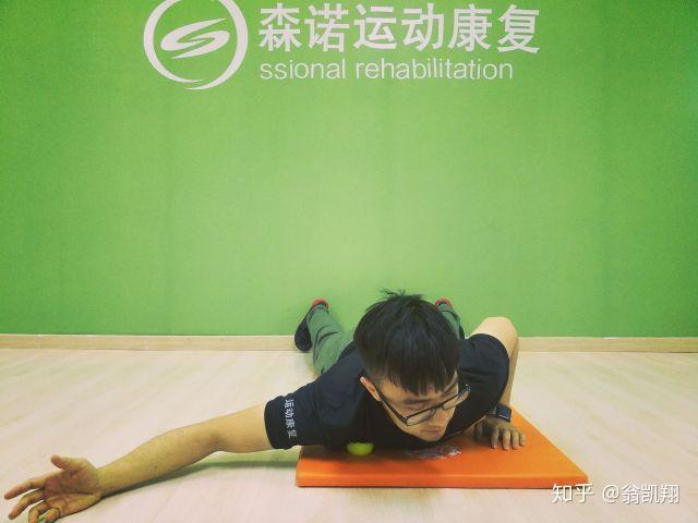 2、放松胸小肌:俯卧位,用网球放在胸小肌的位置,一侧手向斜上伸展,另一侧支撑身体并滚动网球。