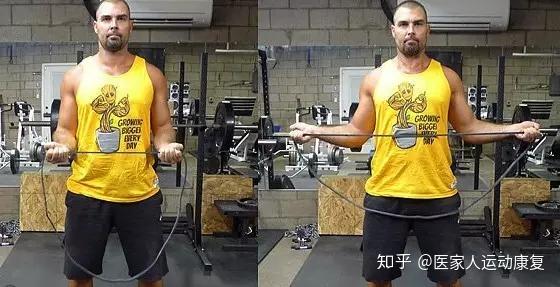双手屈曲90度,手上紧握一条橡巾带,最好两边腋下各夹一条厚的毛巾,确保整个动作我们的手肘贴紧身体。