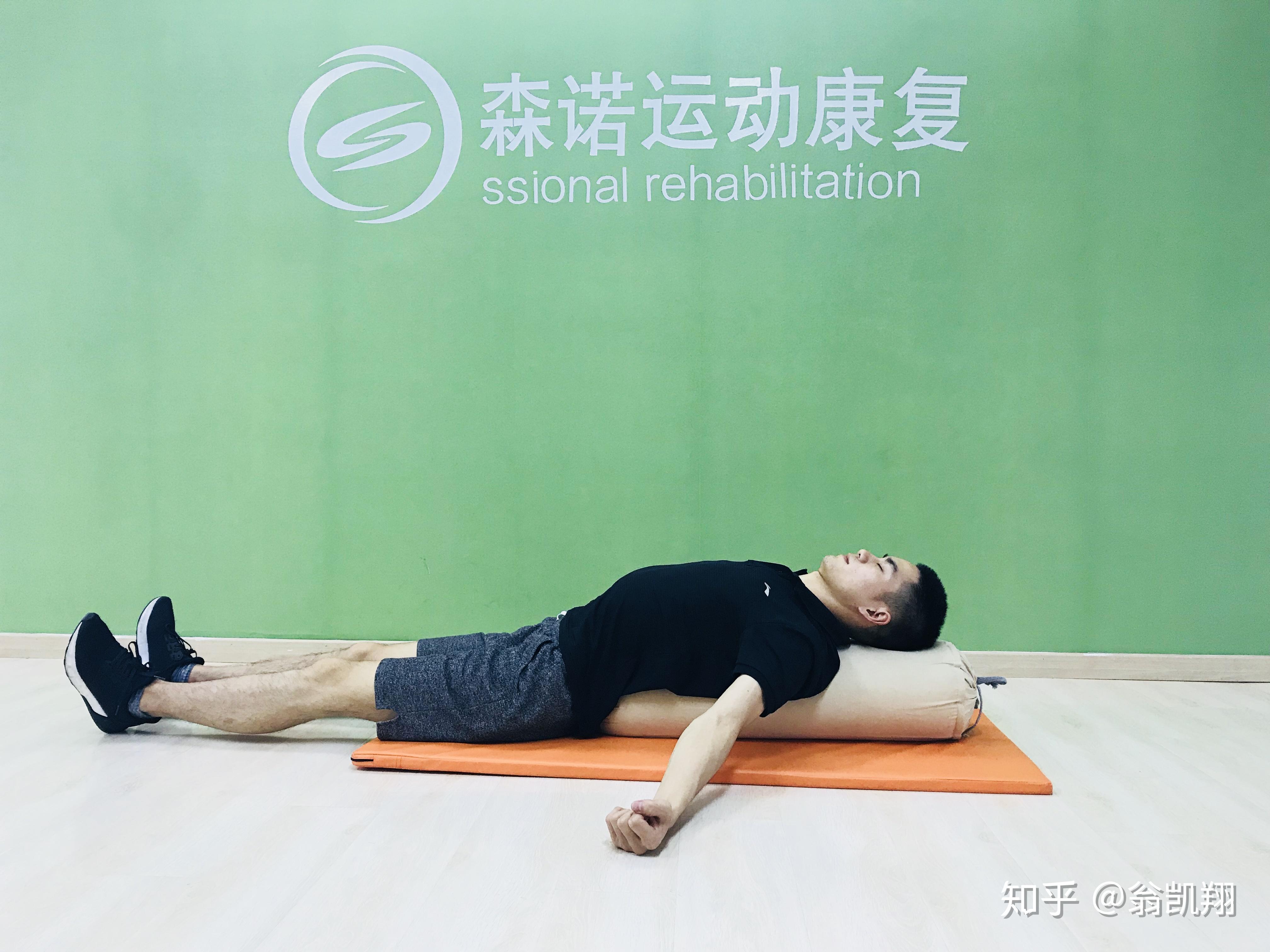1、放松胸大肌:侧卧位,一手放在斜上方,一手放在胸前支撑身体,拉伸胸大肌。