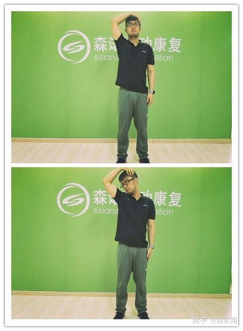 3、肩膀向后撇。就是现做一个肩膀的前后绕园动作,找那个肩膀向后撇的感觉,两个肩胛是有点夹住的。尤其ta已经有点驼背,这个夹住的感觉更强烈,然后肩膀大臂放松,让胳膊自然下垂在身体前后的中分线上。如果肩膀不后撇,你让ta自己看看,胳膊下垂肯定不在中分线上。