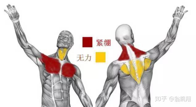 题主说的是公司同事,30出头,长期伏案工作,还有轻微的驼背、颈前伸等现象。已经逐渐向上交叉靠拢了,所以,要在伏案工作的时候要尽量保持和运动起来。是以错误的久坐姿势导致背部肌肉一直处于拉长状态,背部肌肉没有力量,造成前侧(胸肌)肌肉和肩颈上斜方肌紧张;而深层颈部肌肉和下背方斜方肌无力,久而久之造成上交叉的出现。如图所示: