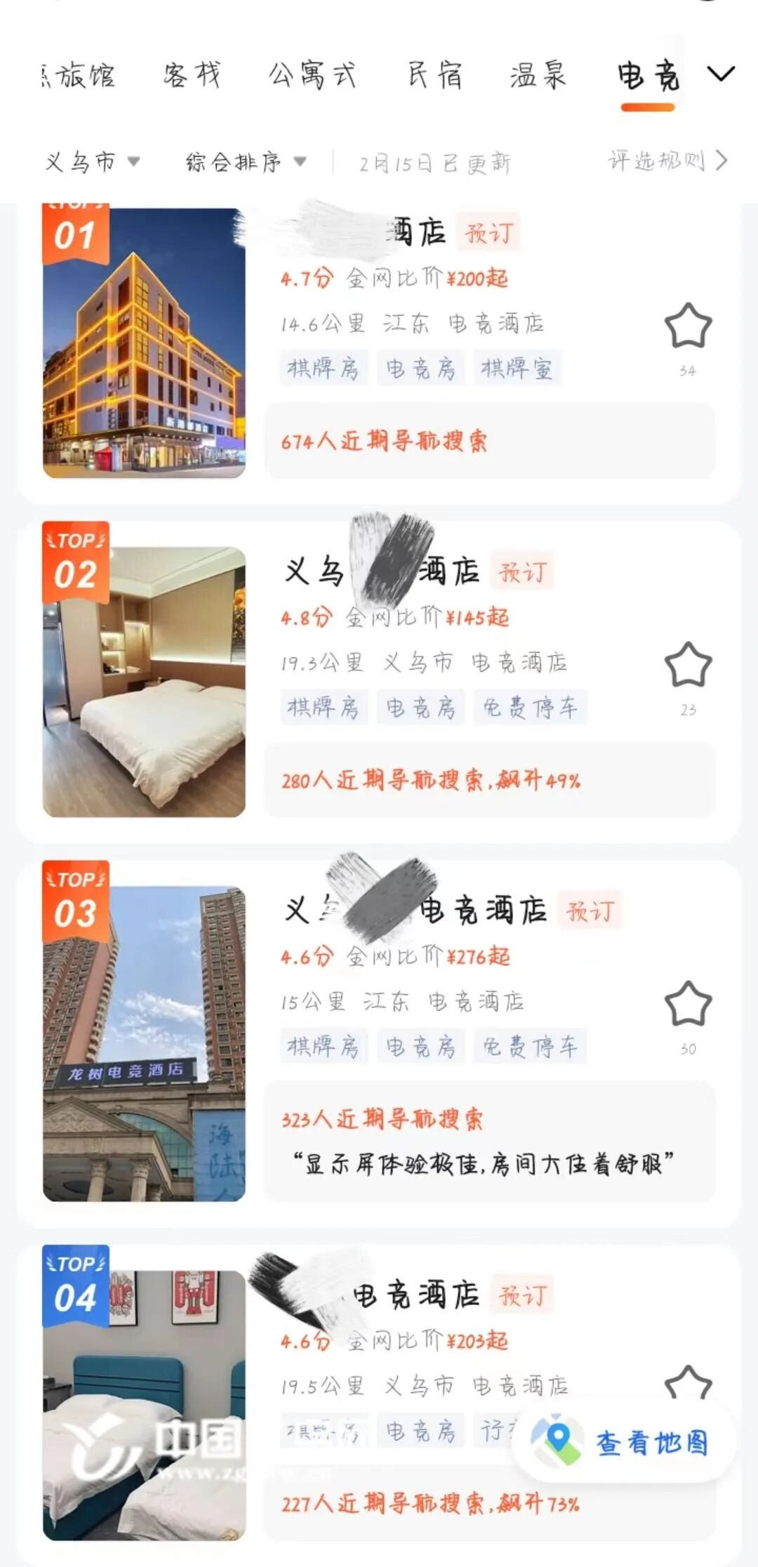 2月15日,记者在某平台搜索义乌“电竞酒店”等关键词后,发现词条推送近二十个相关结果。