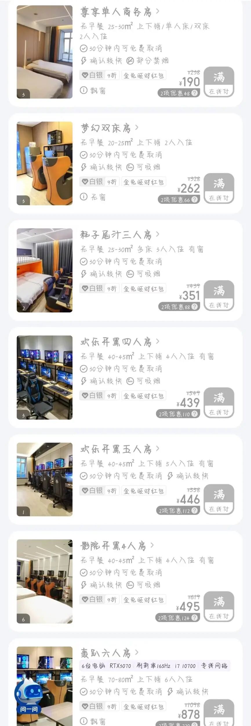“根据客户的不同需求,我们将房间装饰成不同主题和风格,比如舒适型、豪华型、轻奢型,还有不同的娱乐项目,有些不仅可以电竞还能棋牌麻将。”某酒店客服“透露”。