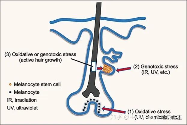 研究人员发现,年龄的增长,外界环境刺激,以及化学元素刺激会导致黑素细胞内积累大量的活性氧,这些强氧化物会破坏线粒体和细胞核DNA、影响酪氨酸酶活性从而降低黑色素的生产效率;另外,毛囊中持续积累的过氧化氢会把黑色素氧化褪色让头发变白(头发漂白的原理就是用过氧化氢让黑色素褪色)。