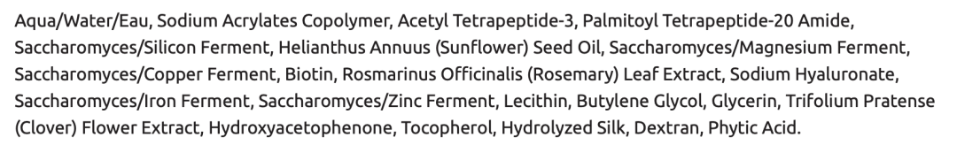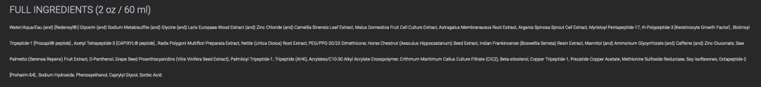 这款产品不但含白转黑成分GREYVERSE?(内含【棕榈酰四肽-20】)还添加了有助于让头发变浓密的CapixyI?(内含【乙酰基四肽3】和【红车轴草花提取物】),再加上【生物素】、微量元素【铜】、【铁】、【锌】等和抗氧化的【迷迭香提取物】,虽然很小众,但是胜在配方还不错,值得试试!