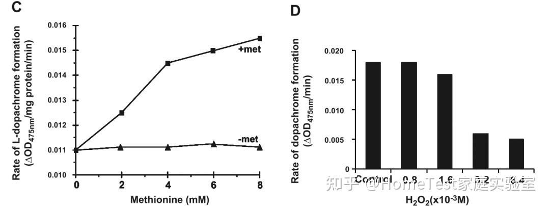 英国Bradford大学生物医学系的Schallreuter 团队研究表明,外源的L-蛋氨酸可以在体外防止蛋白质中蛋氨酸残基的氧化,加入L-蛋氨酸可防止过氧化氢诱导的酪氨酸酶抑制【2】。