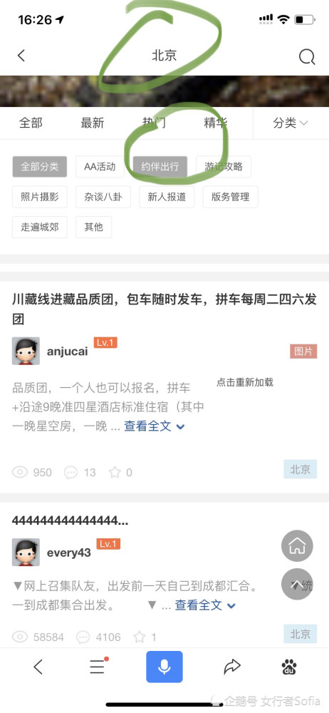 如果你不喜欢这种方式呢,可以个人私底下结伴,那就找到你所在的城市,在你所在的城市的版面里面会有一个“约伴出行”,比如我这里就选了北京,底下就?约伴出行,然后你就发个帖子写上你的行程和信息就好了。