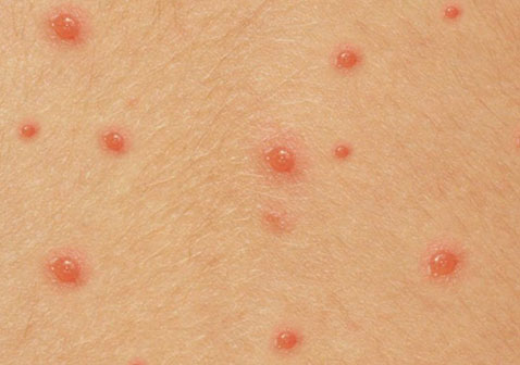 2.丘疹性荨麻疹:为昆虫叮咬引起的皮肤炎症反应,表现为四肢、躯干散在丘疹,有的顶端有小水疱。瘙痒明显,一般无发热、头痛、乏力等症状。