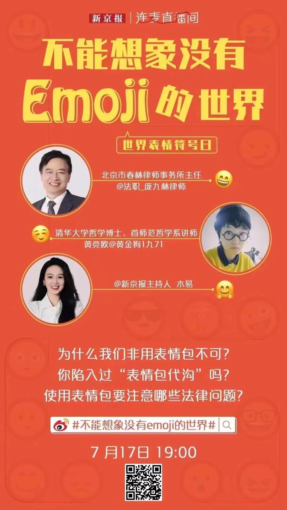 7月17日是世界表情符号日,新京报邀请北京春林律师事务所主任庞九林律师,清华大学哲学博士、首都师范哲学系讲师黄竞欧一起聊聊表情符号的法律问题。