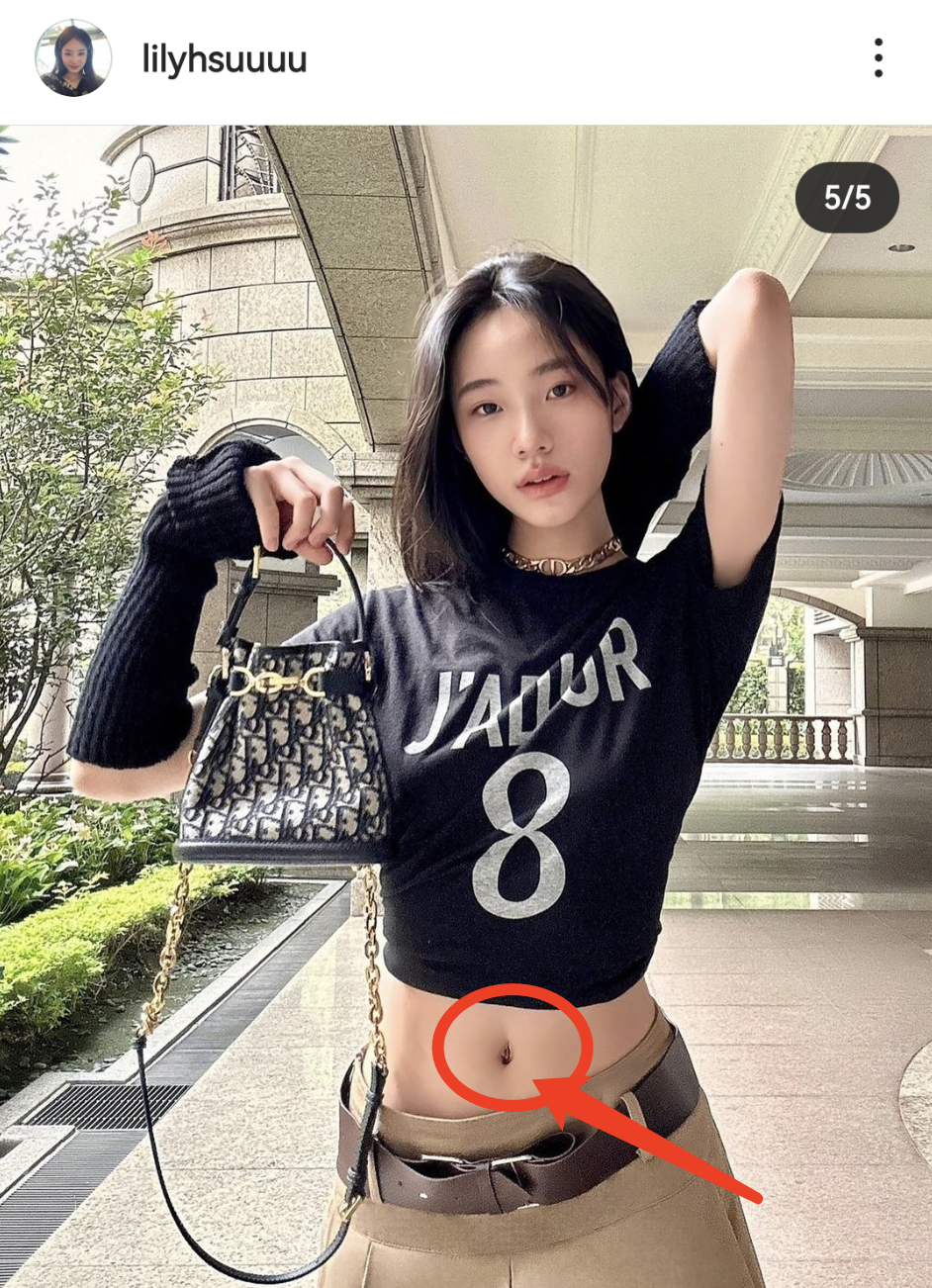 一个多月前,Lily还穿着露脐装手持大牌包包拍广告硬照,因为太高清,所以有网友在评论区里提醒她,肚脐眼太黑该清理一下了,这样确实比较影响形象。