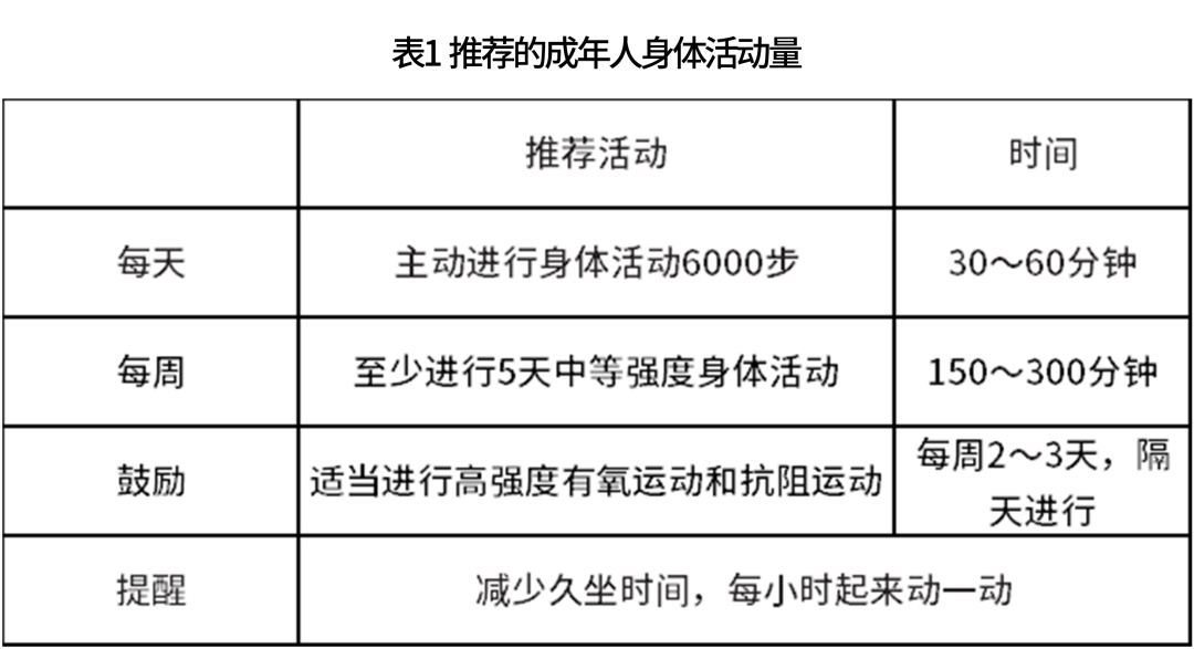坚持日常身体活动,每周至少进行5天中等强度身体活动,累计150分钟以上;主动身体活动最好每天6000步。